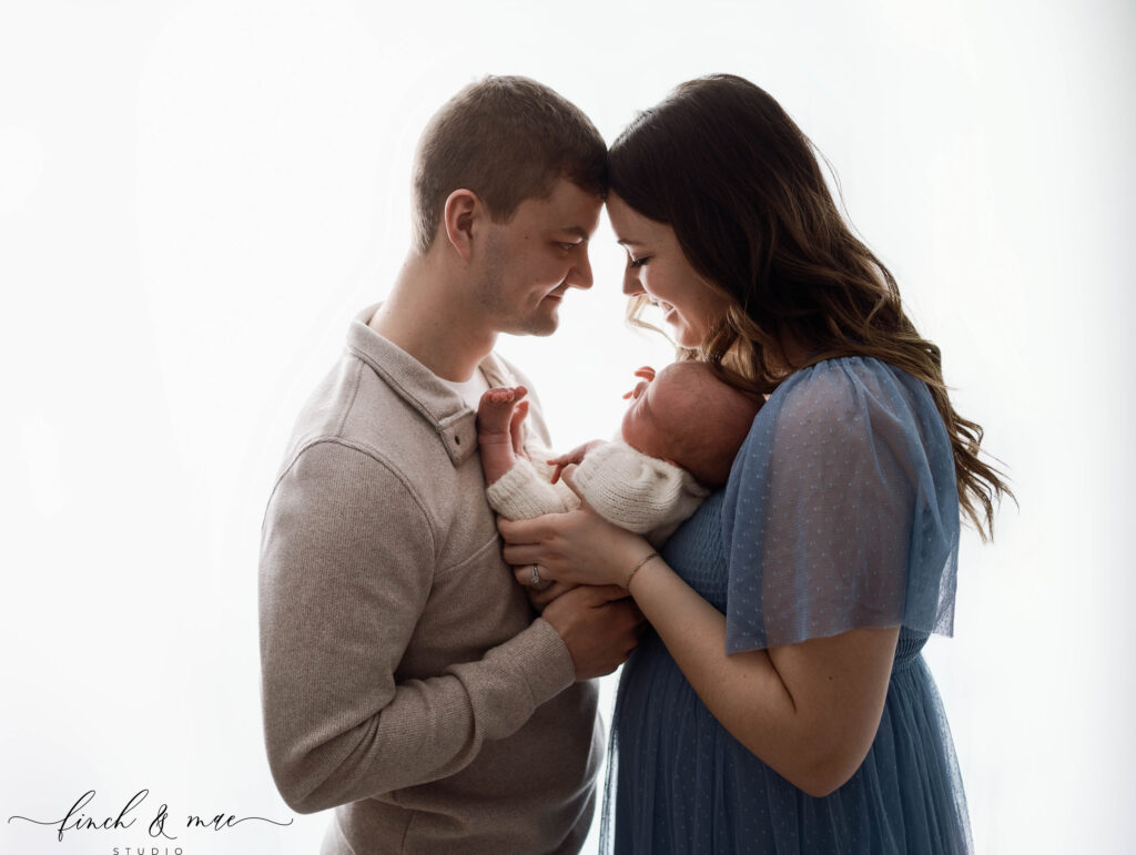 At Finch & Mae Photography Studio, newborn sessions take place in a calm, cozy studio just outside of Madison, designed specifically for newb parents. Every session includes expert newborn safety, full styling guidance and access to a curated client wardrobe for moms. This makes the experience easy and stress-free from start to finish.